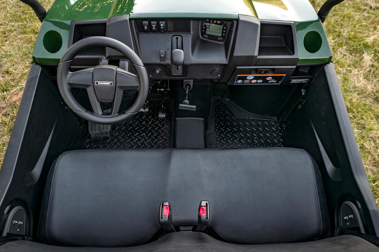 Kawasaki’s high-grade electric power steering (EPS) system is speed sensitive, offering light steering at low speed, while reducing assistance as vehicle speed increases to tighten up the steering. It also enhances ride comfort and control by acting as damping system, reducing bump steer and kickback to the steering wheel caused by shocks to the wheels. Drivers can set the position of the tilt-adjustable steering wheel to suit their preference, as well as lift it out of the way to facilitate getting in and out of the vehicle.